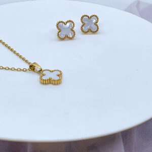 Bahr Van Cleef Style Clover Pendant Necklace & Matching Clover Stud Earrings Set White