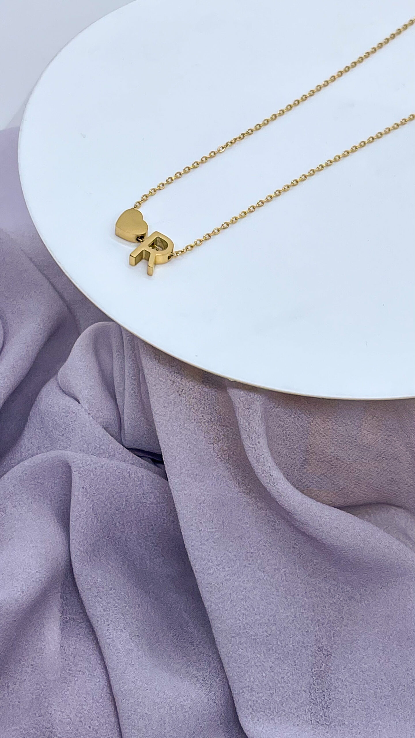Bahr Stainless Steel Letter Necklace – R Letter with 3D Heart Pendant – Gold