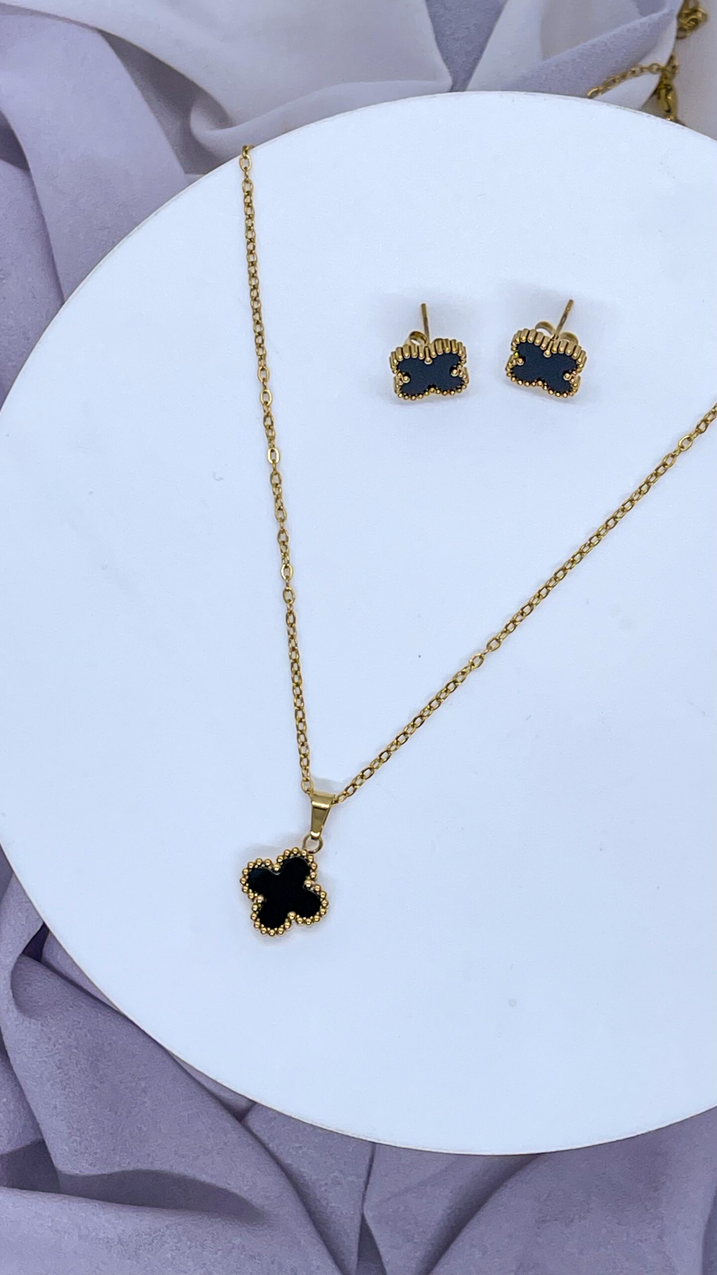 Bahr Van Cleef Style Clover Pendant Necklace & Matching Clover Stud Earrings Set Black